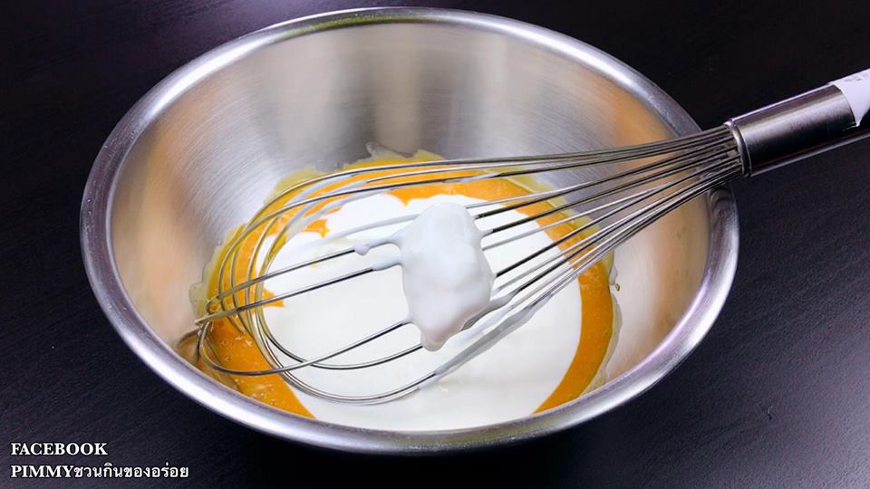 5. ผสมไข่แดงกับวิปปิ้งครีมให้เข้ากัน