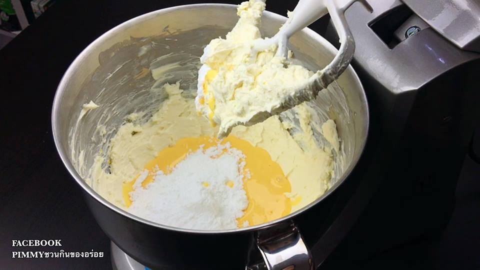 5. เอาครีมชีสลงอ่างผสม ตีด้วยความเร็วกลางประมาณ 3 นาที