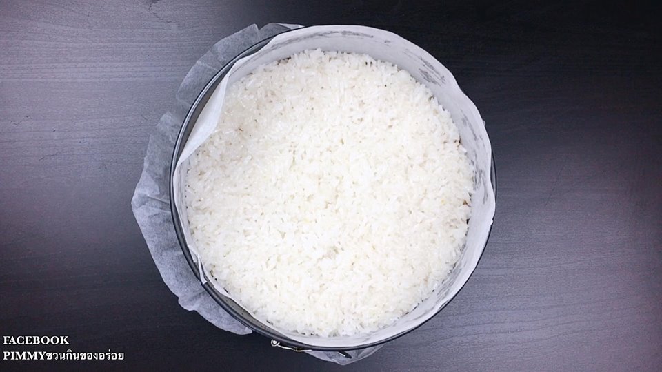6.เอาแครกเกอร์ออกจากตู้เย็น ใส่ข้าวเหนียวมูน เกลี่ยให้เสมอกัน แต่ไม่ต้องกดให้แน่น