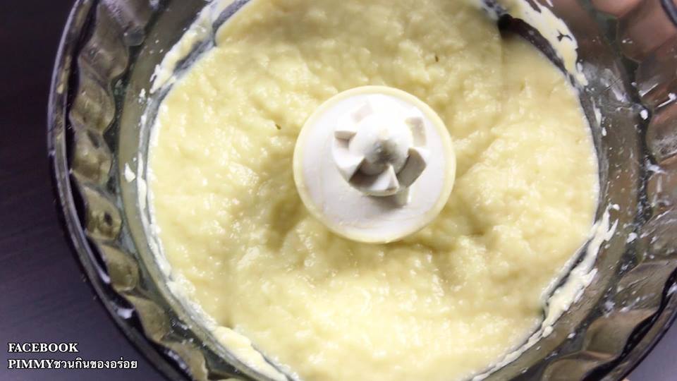 ตีด้วยความเร็วสูงสุดประมาณ 7 นาที หรือจนกว่าส่วนผสมเนียนเด้งเข้ากันดีแล้วใส่เนื้อทุเรียนบดลงไป ตีต่อด้วยความเร็วกลาง 2-3 นาที
