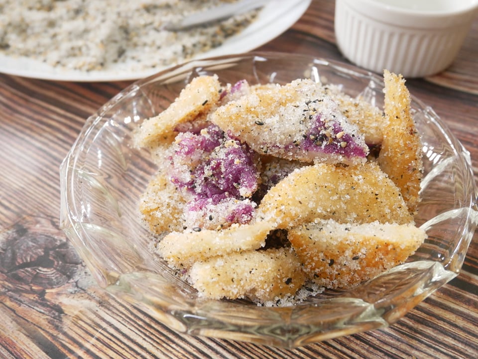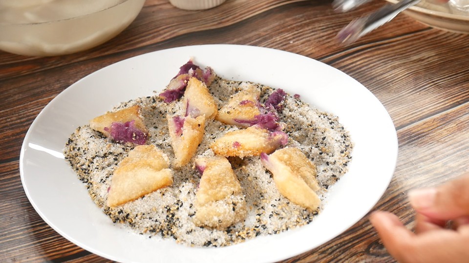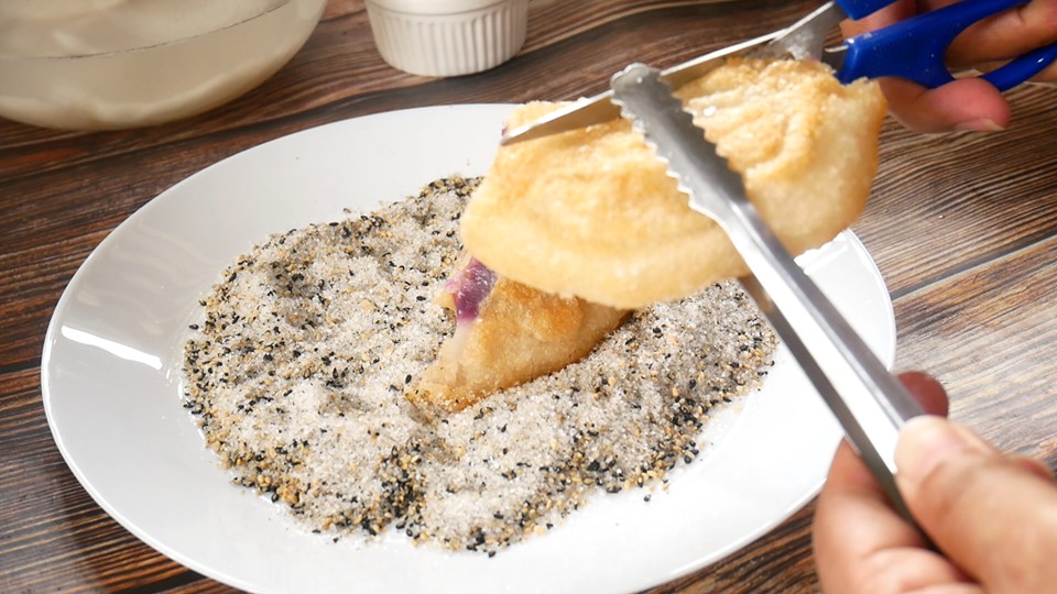 7. หลังจากนั้นตักขึ้นให้สะเด็ดน้ำมัน แล้วตัดเป็นชิ้นเล็กๆ คลุกเคล้ากับน้ำตาลและงาที่ผสมไว้ เสร็จแล้วพร้อมตักเสิร์ฟค่ะ