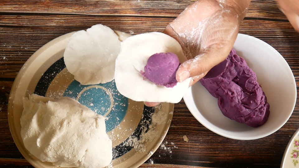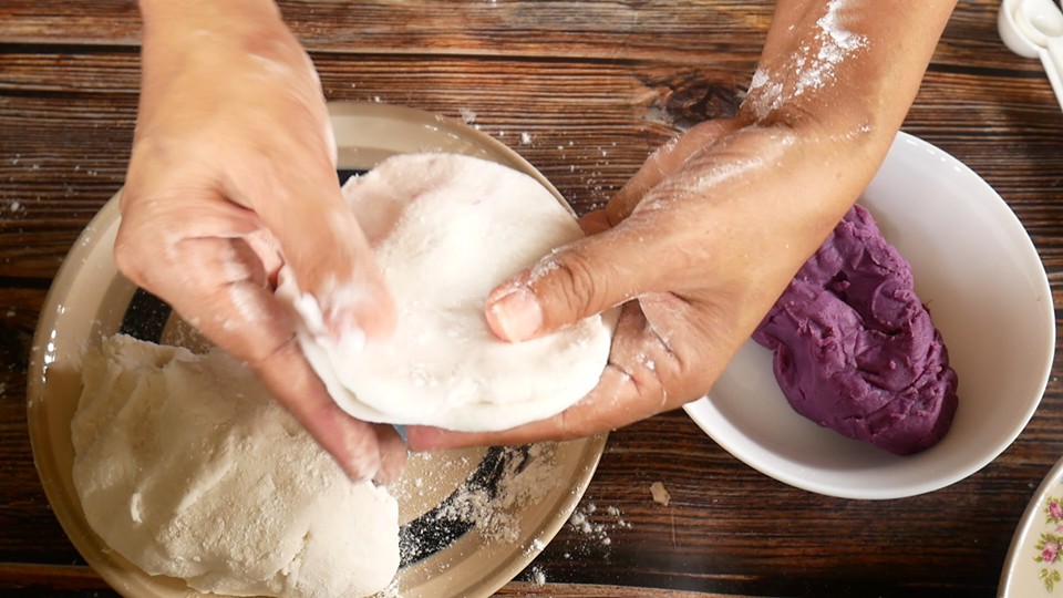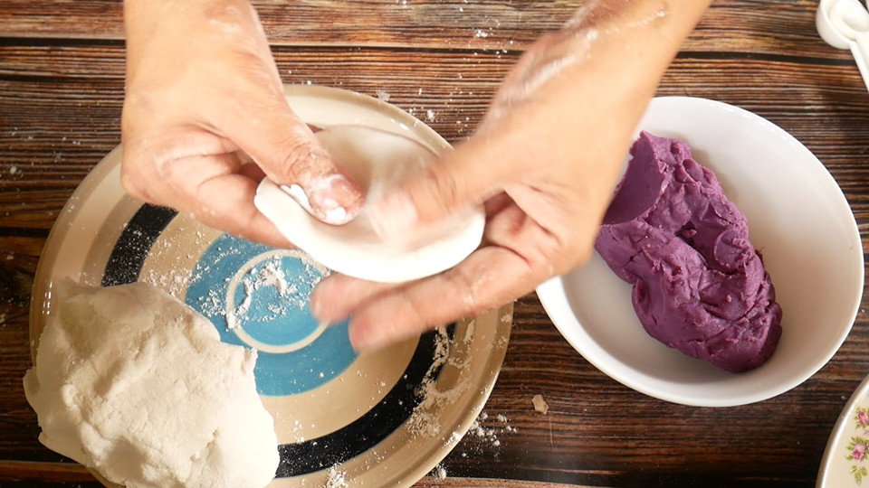 3. นำแป้งมาปั้นเป็นก้อนและรีดเป็นแผ่นกลมความหนาตามชอบ อาจจะใส่ใส้มันม่วง หรือเผือกกวน