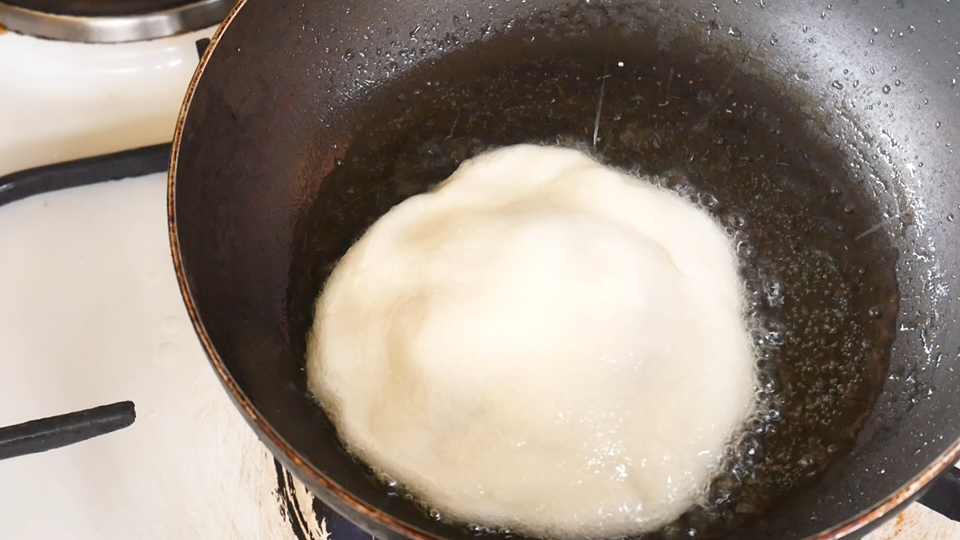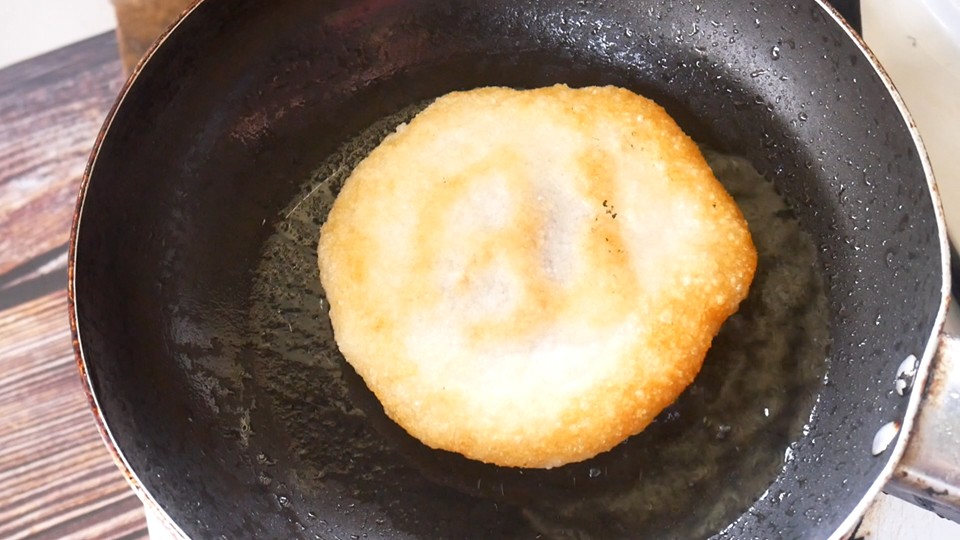 5. นำกะทะตั้งไฟเปิดไฟปานกลาง ใส่น้ำมันพืช พอกะทะเริ่มร้อนให้ใส่ชิ้นขนมที่ต้มไว้ลงไปทอดจนเหลืองกรอบ