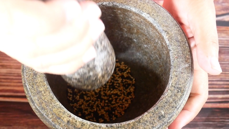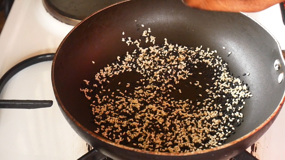 1. คั่วงาขาว งาดำให้หอม แล้วนำไปตำ หลังจากนั้นตักใส่ถ้วยผสมกับน้ำตาลทรายและเกลือแล้วพักไว้