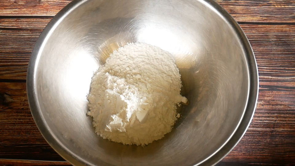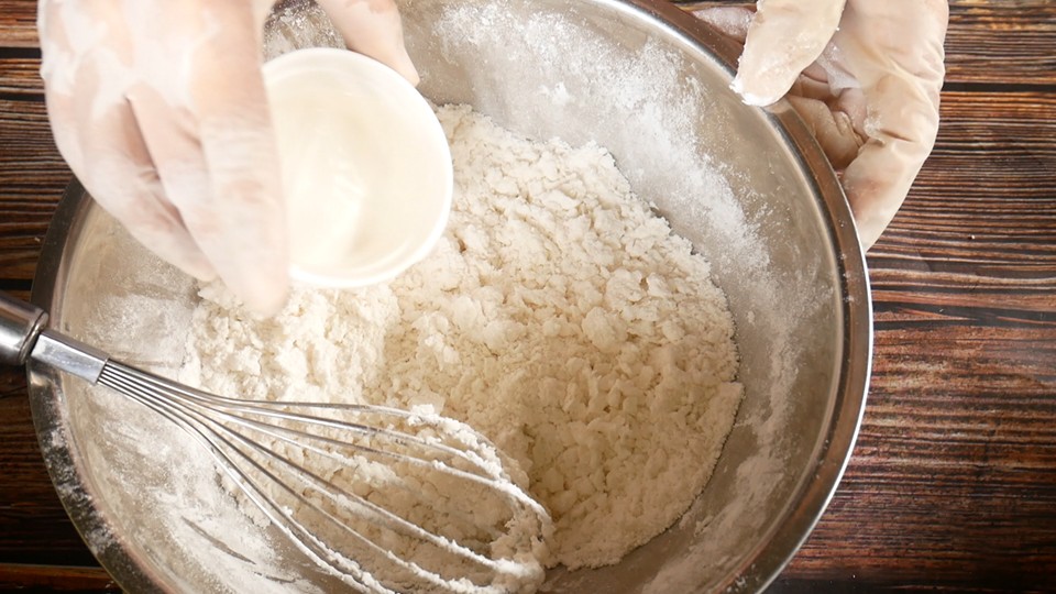 2. นำแป้งข้าวเหนียวมาผสมกับเกลือ หลังจากนั้นนวดด้วยน้ำร้อนจนแป้งนิ่มปั้นเป็นก้อนได้