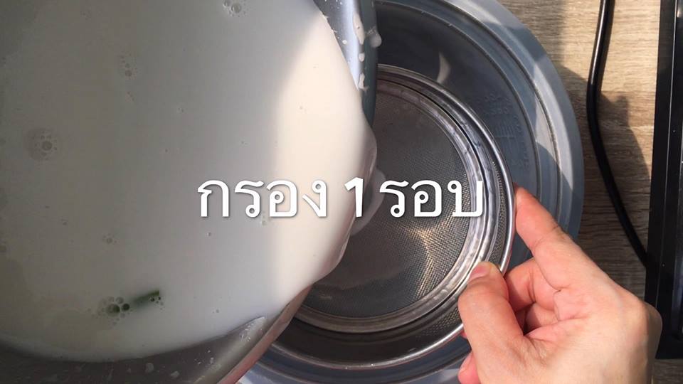 -นำนมกับกะทิผสมกัน แล้วเอาไปปั่นรวมกับใบเตยแล้วกรอง 2 รอบ เพื่อจะได้รสและกลิ่นจากใบเตยค่ะ ……(1)