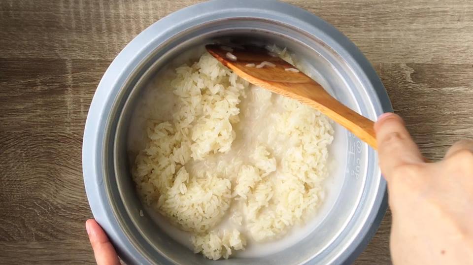 – ใช้ไม้พายกวนให้ส่วนผสมเข้ากัน แล้วปิดด้วยผ้าขาวบาง ทำซ้ำ 3-4 รอบ จนข้าวดูดเอาน้ำกะทิหมด