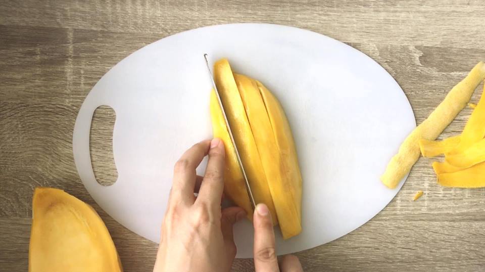ทอดแป้งเสร็จก็มาหั่นมะม่วง หั่นเป็นแนวยาว