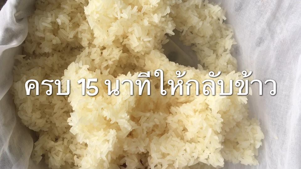 – นำข้าวไปนึ่งประมาณ 30 นาที เราจะไม่ให้ข้าวสุก 100% เอาสุกประมาณ 80-90% เวลามูลจะได้ไม่เละค่ะ และครบ 15 นาทีต้องกลับข้าว ข้าวจะได้สุกทั่วถึง