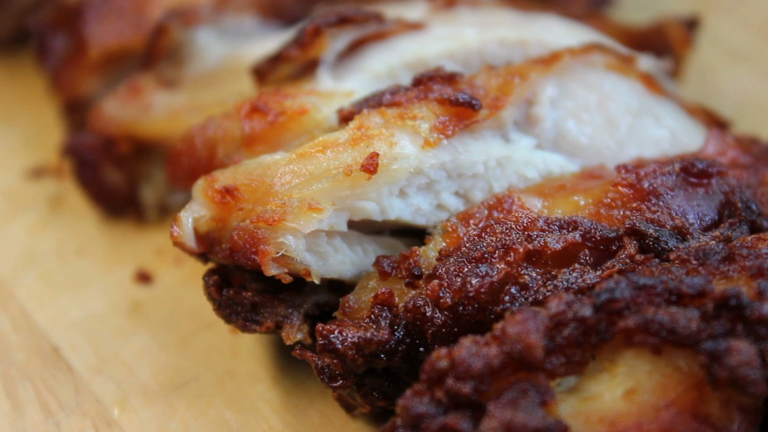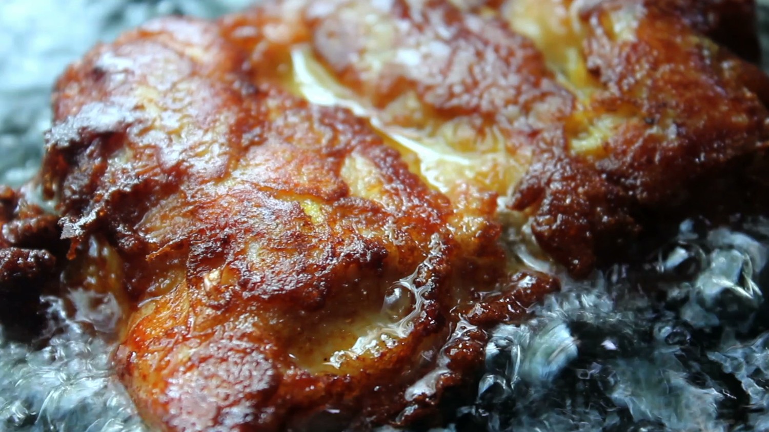 นำไก่ลงทอดในกระทะจนสุกทั้งสองด้าน