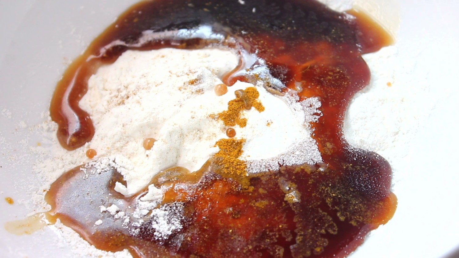 ใส่ผงกระหรี่ น้ำมันหอย น้ำตาล ซีอิ้วขาว และน้ำเปล่า ลงไปผสมให้แป้งเป็นเนื้อเดียวกัน