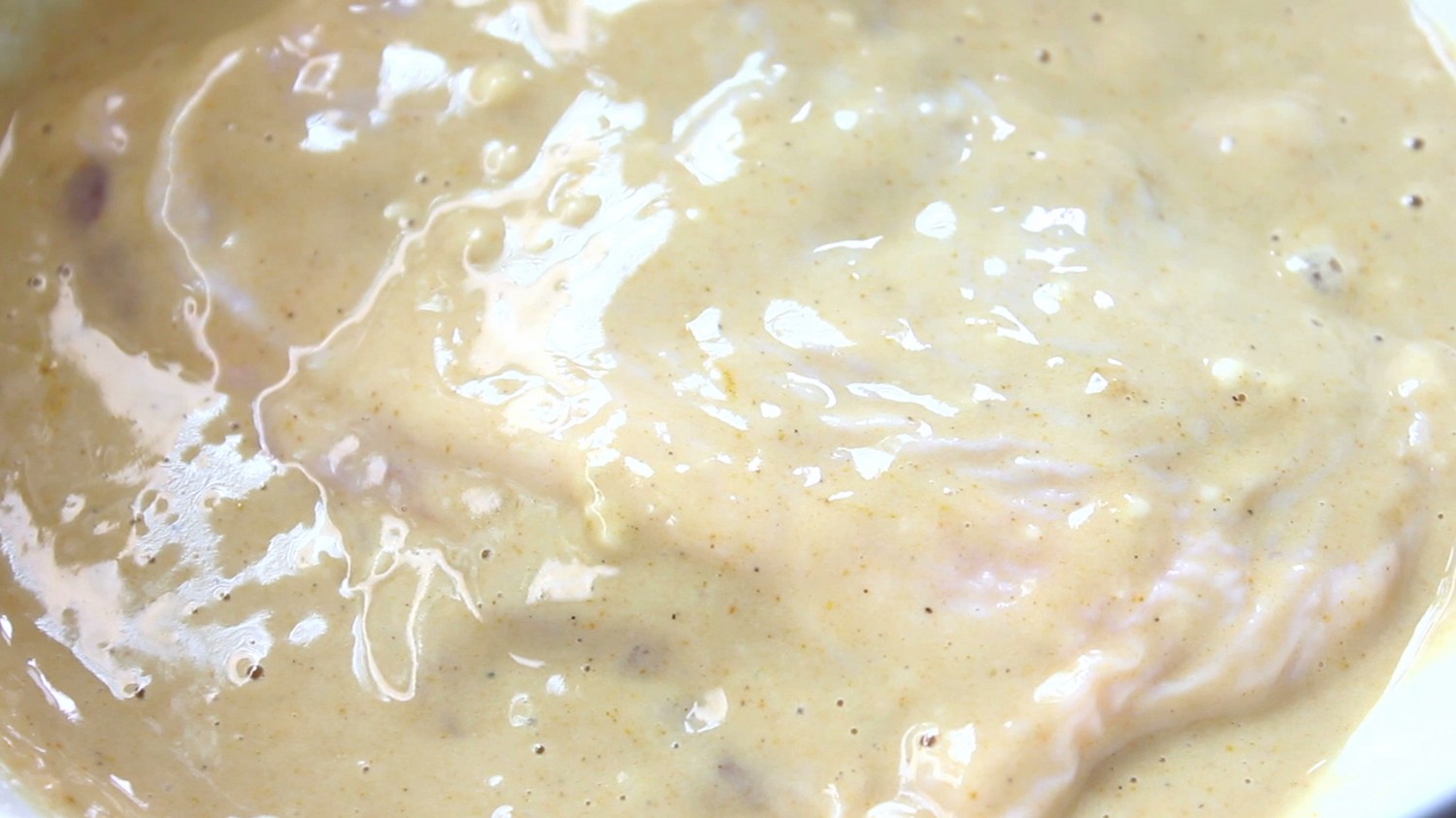 นำเนื้อไก่ลงคลุกกับแป้งที่ผสมไว้ ให้เนื้อแป้งอาบทั่วชิ้นไก่ (หากมีเวลาหมักทิ้งไว้สักครึ่งชั่วโมงจะทำให้ส่วนผสมเข้าเนื้อกันได้มากยิ่งขึ้น)