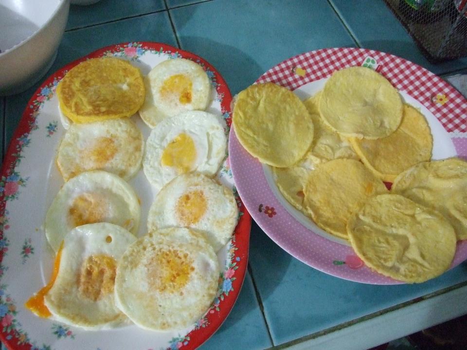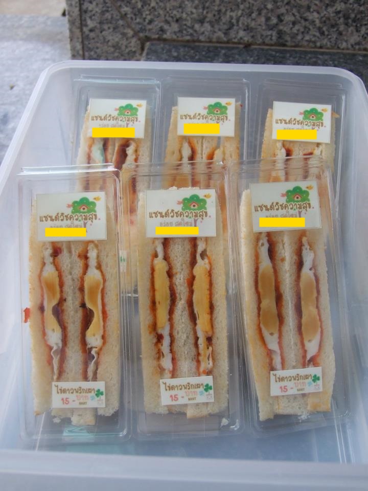 ทอดไข่เป็นวงกลมทั้งไข่ดาวและไข่เจียวใช้ซอสน้ำพริกเผา กับ มายองเนส 2 อย่างค่ะ ทาบนขนมปัง และทาบนไข่ 2 ที รองรับทั้งของเด็กและผู้ใหญ่