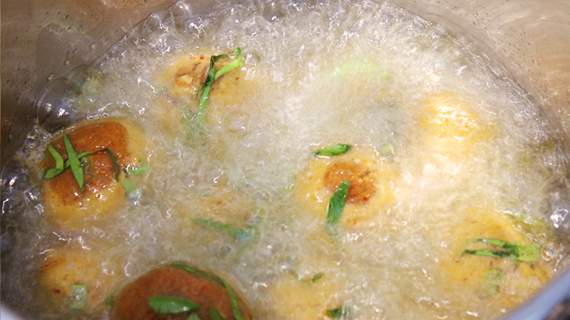 นำทอดมันหมูสับห่อไข่ทอดในน้ำมัน ใช้ไฟลกางตนสุกเหลืองหอมเป็นอันเสร็จ