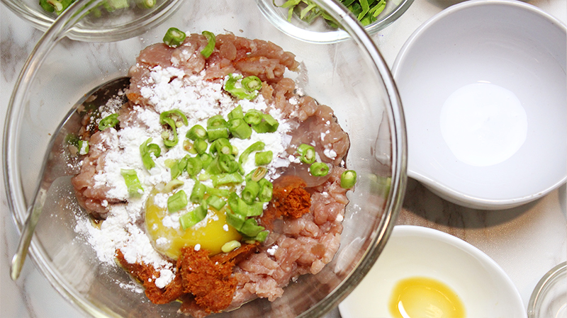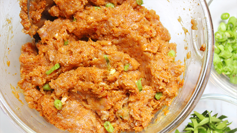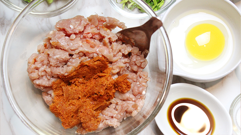นำเนื้อหมูสับผสมกับพริกแกงปรุงด้วยเครื่องปรุงต่างๆ และไข่ไก่พร้อมกับถั่วฝักยาวหั่นชิ้นเล็ก จากนั้นผสมคลุกเคล้าให้เข้ากัน