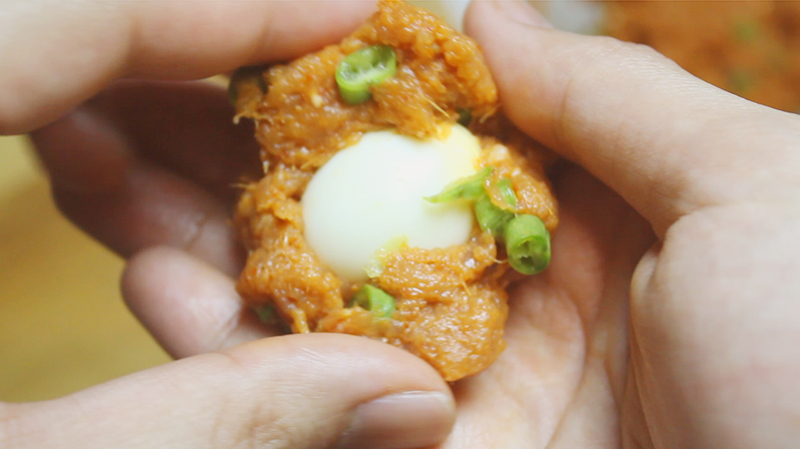 นำเนื้อทอดมันประมาณ 1 ช้อนโต๊ะพูน มาคลี่ให้แบนบนฝ่ามือแล้วนำไข่นกกระทาต้มสุกใส่ลงไป จากนั้นจึงนำทอดมันอีกส่วนปิดทับ ใช้มือกดให้แน่นให้ทั่ว