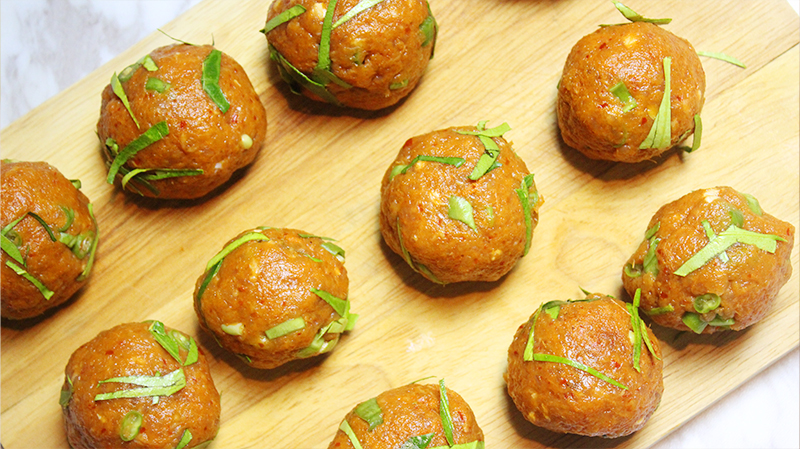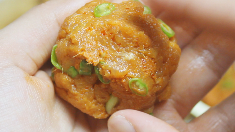 ใช้มือหรือช้อนคนเนื้อทอดมันจนได้เนื้อทอดมันเนียนนุ่ม เนื้อละเอียด