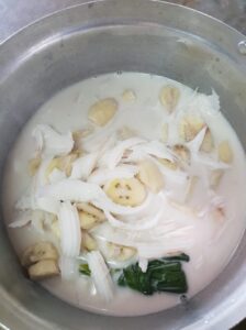 4.ใส่กล้วยที่นึ่งไว้ตามด้วยมะพร้าวอ่อน