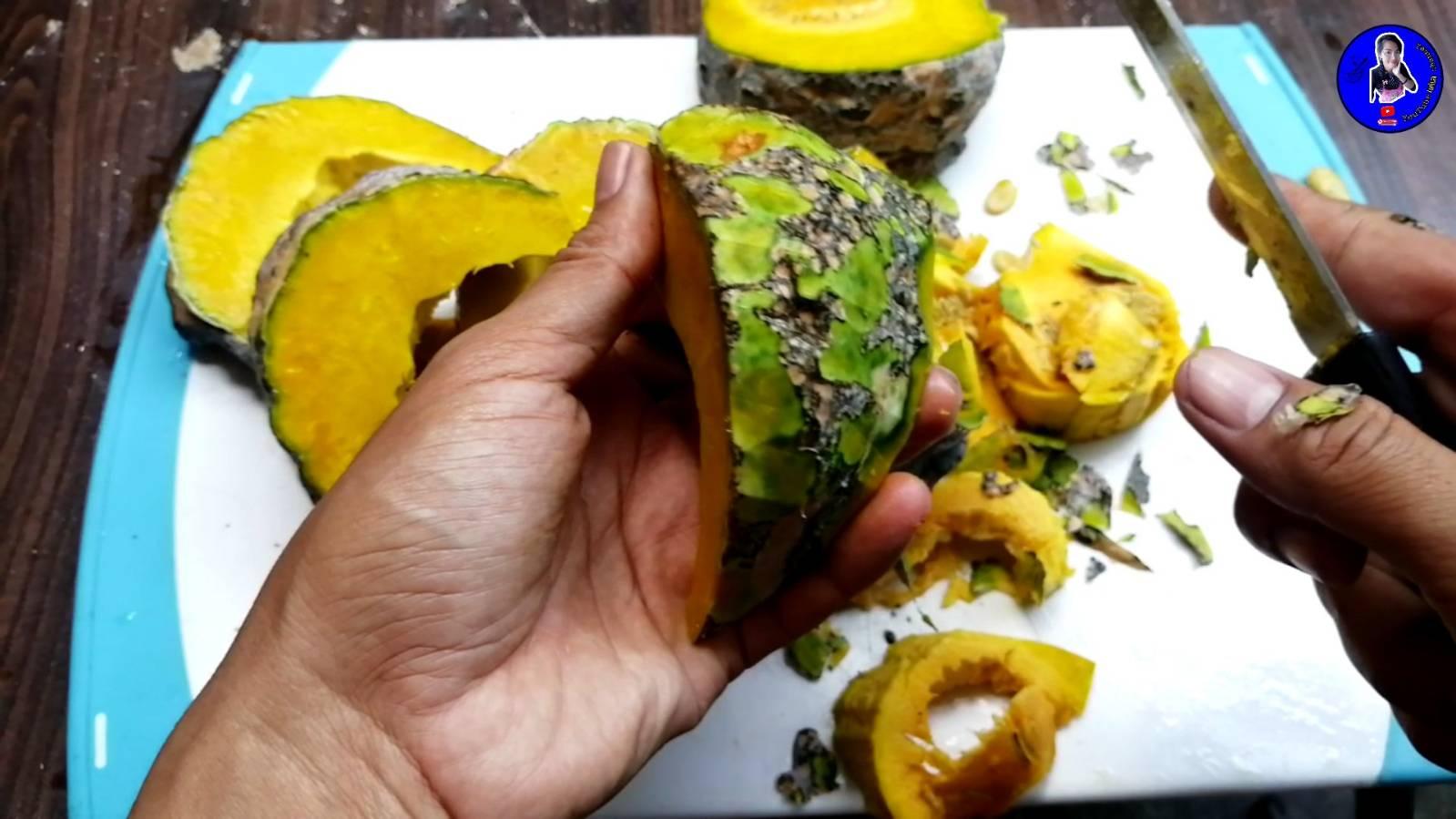 ปอกเปลือกฟักทอง ให้เหลือเปลือกติดไว้บ้างนะคะ เพราะเมื่อฟักทองสุกจะได้ไม่เละ