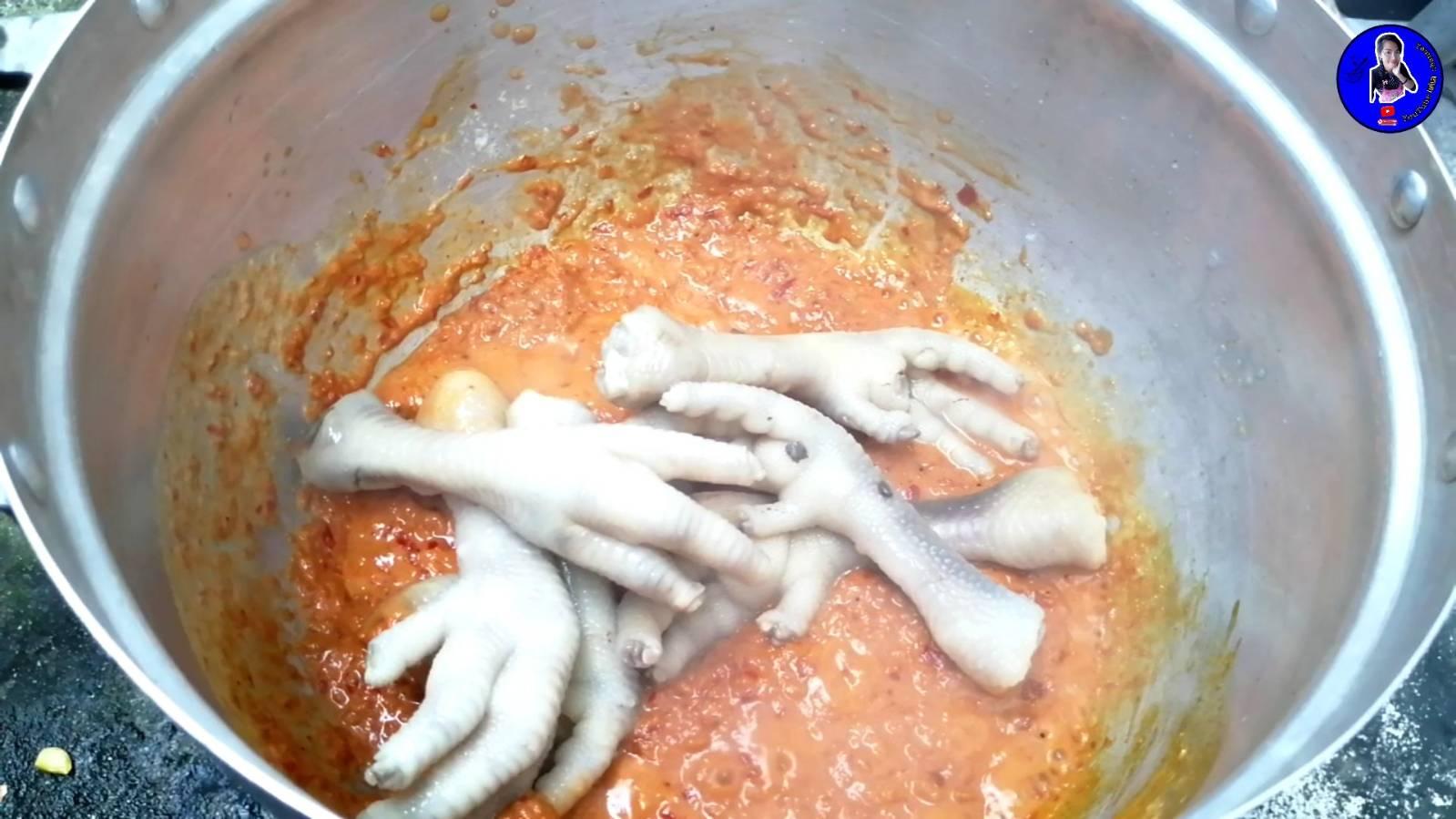 หลังจากนั้น ใส่ตีนไก่ที่ต้มจนเปื่อยแล้วลงไป
