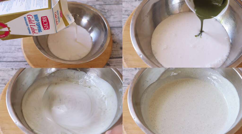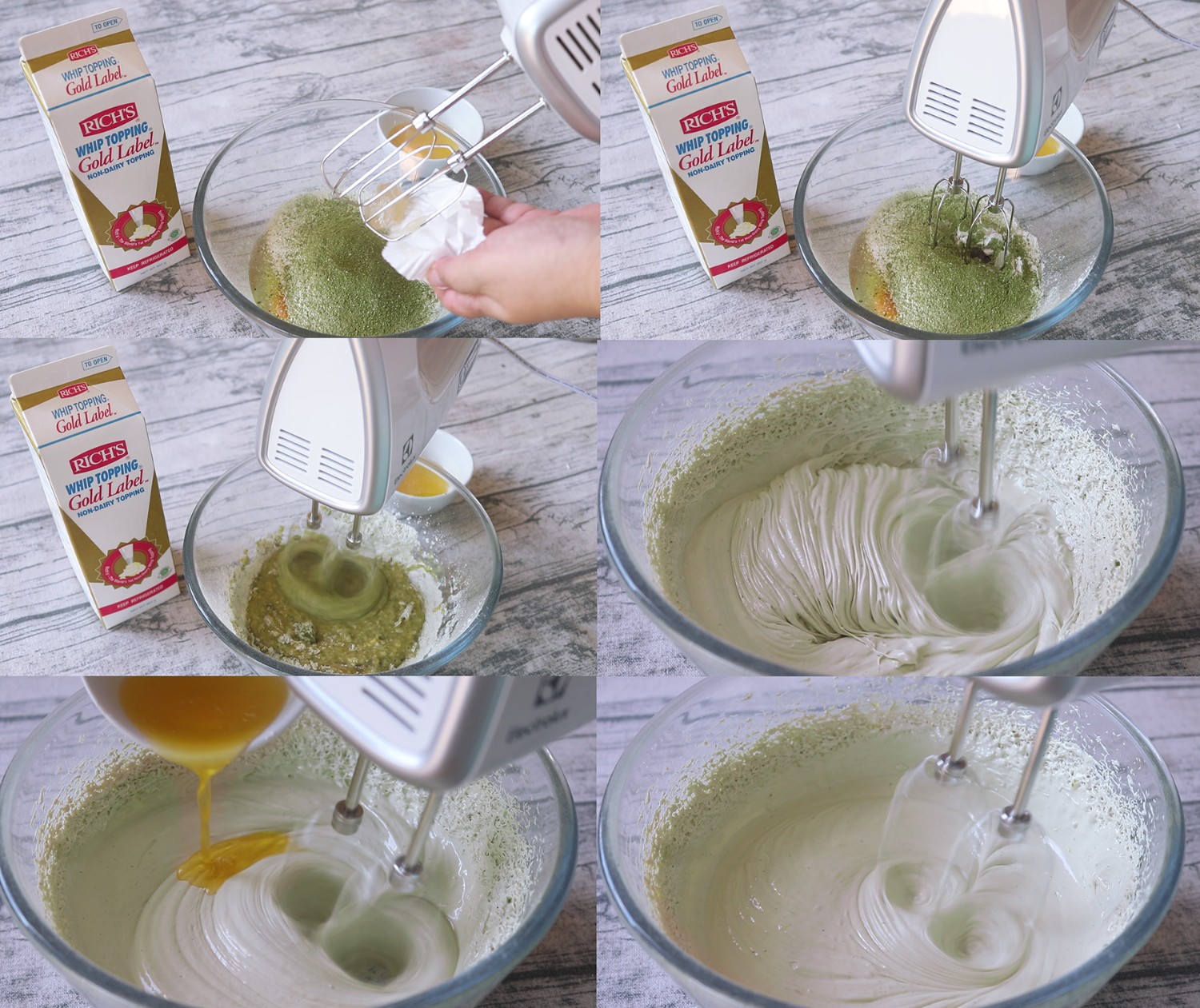 9.เท ริชส์ โกลด์ เลเบล ลงไปในชามผสม ทำเป็นรสชาเขียว นำชาเขียวที่ผสมไว้ใส่ลงไป คนให้เข้ากัน