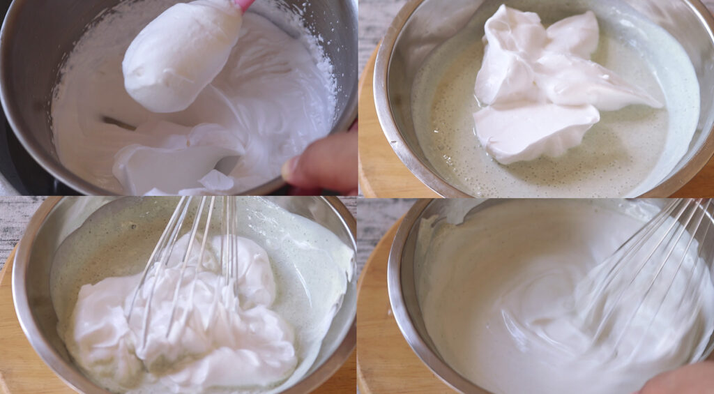 10.จากนั้น แบ่งวิปครีมที่ตีจนตั้งยอดแข็ง นำมาผสมในชามวิปปิ้งครีมที่ยังไม่ตี ผสมจนได้ความข้น เหลว ตามต้องการ
