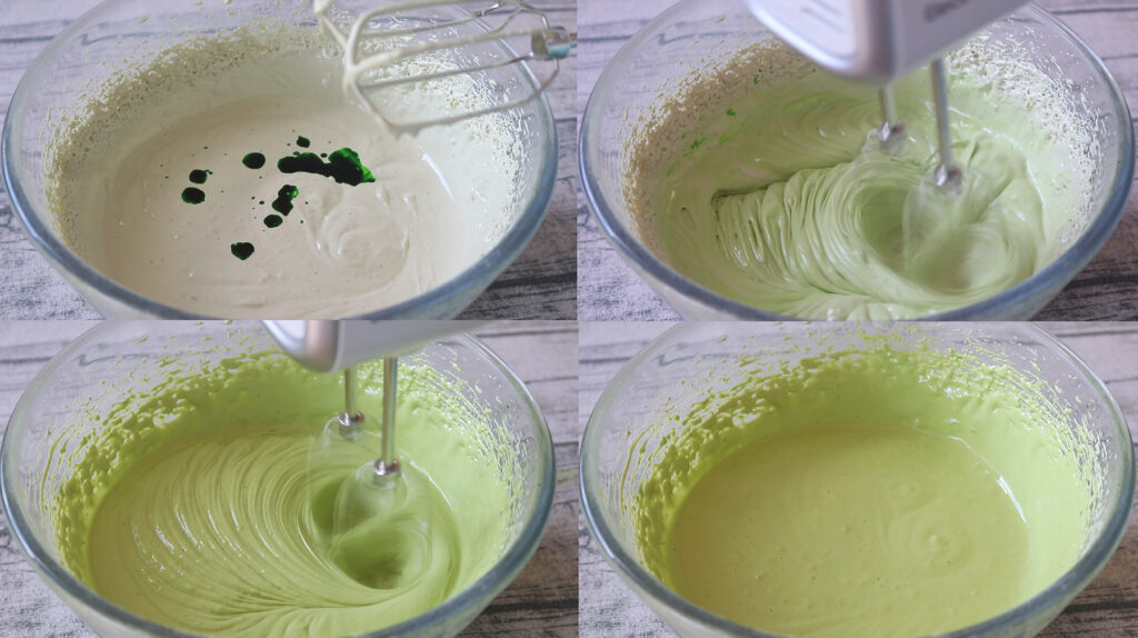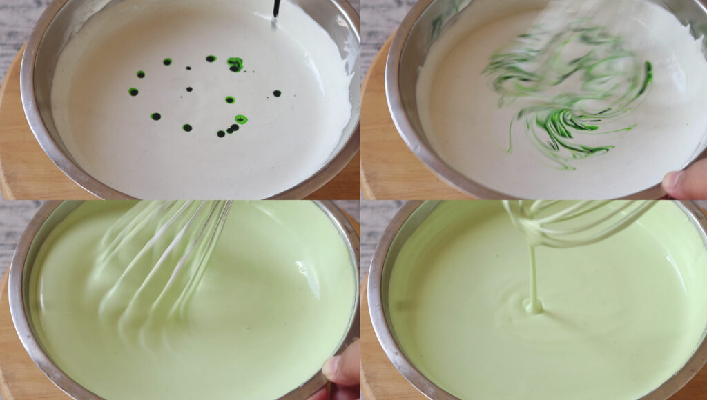3. ใส่สีเขียวลงไป ตีให้เข้ากัน