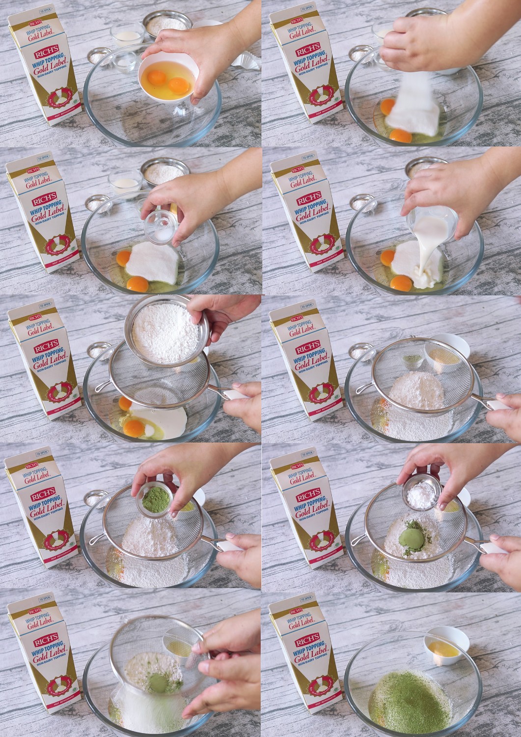 1.ใส่ไข่ไก่ น้ำตาลทราย เกลือป่น นมจืด และร่อนแป้งเค้ก+ผงชาเขียว+ผงฟู ลงไป