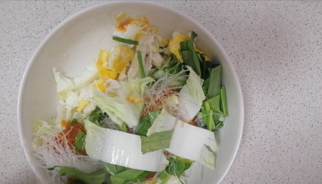 เมื่อครบเวลา 1 นาทีให้นำออกมาใส่ทุกอย่างลงไป เริ่มจากผักต่าง วุ้นเส้น และก็น้ำจิ้มสุกี้ คนคลุกเคล้าส่วนผสมทุกอย่างให้เข้ากัน นำเข้าไมโครเวฟที่ไฟแรงปานกลาง 5 นาที
