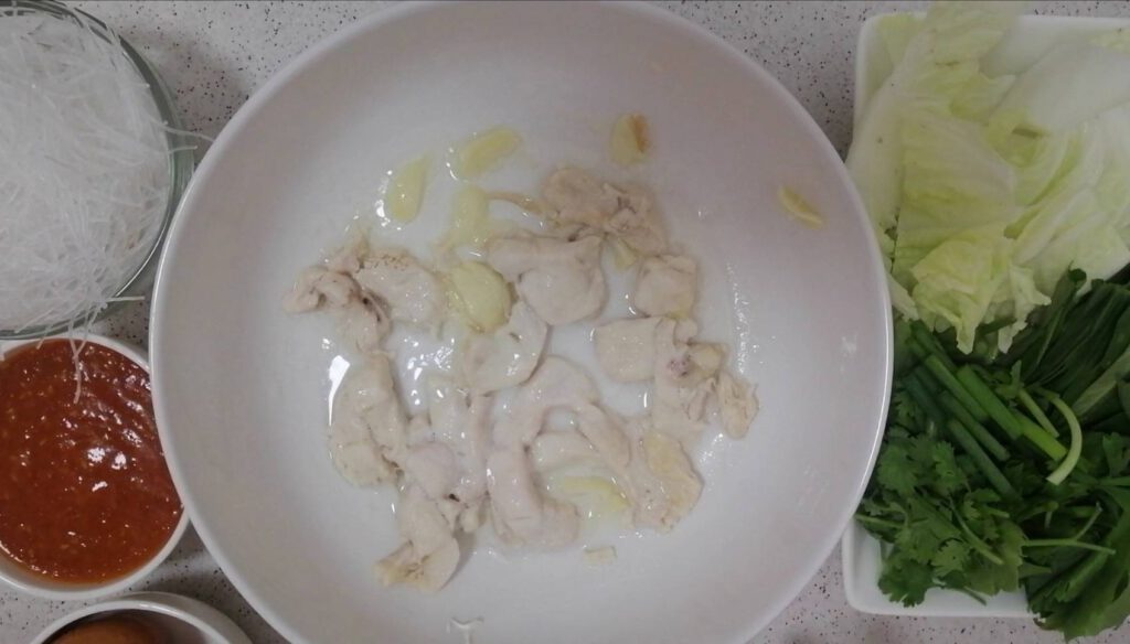 เริ่มจากนำกระเทียมใส่ภาชนะที่สามารถเข้าไมโครเวฟได้ ตามด้วยน้ำมันพืช เนื้อไก่ คนคลุกเคล้าส่วนผสมทุกอย่างให้เข้ากันแล้วนำเข้าไมโครเวฟที่ไฟแรงปานกลาง 3 นาที