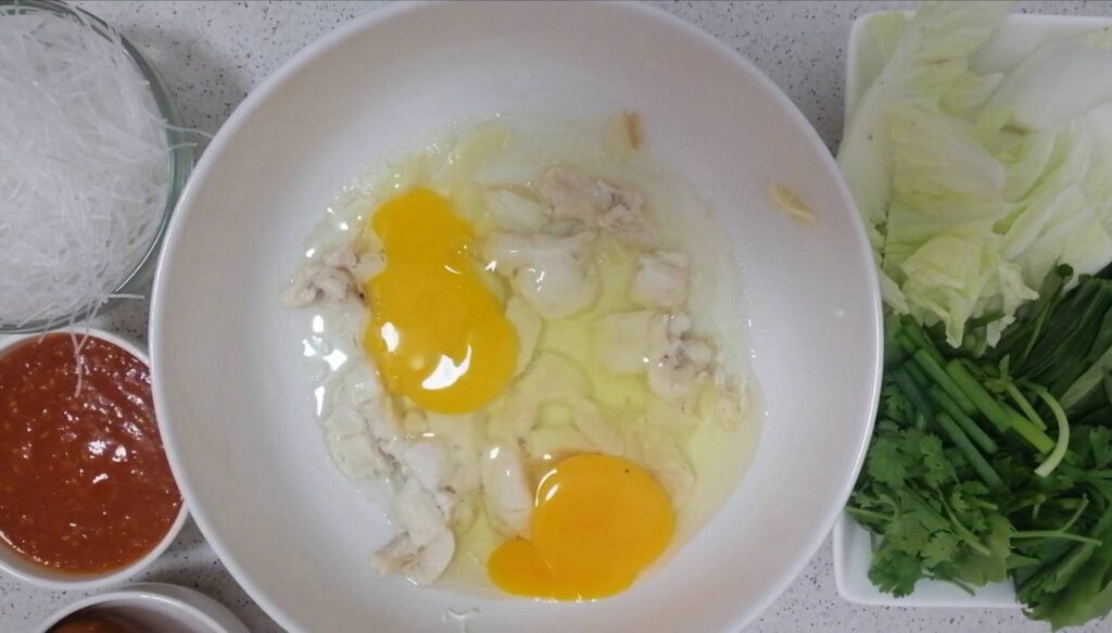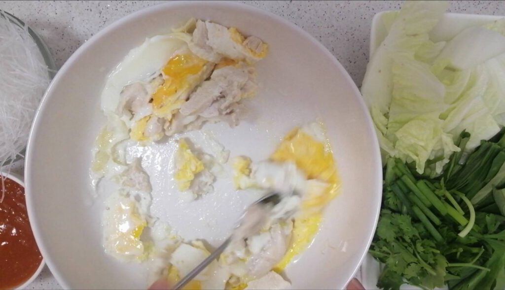 เมื่อครบเวลานำออกมาใส่ไข่ไก่ ยีไข่เล็กน้อย แล้วนำเข้าไมโครเวฟต่อที่ไฟแรงปานกลางเหมือนเดิม 1 นาที