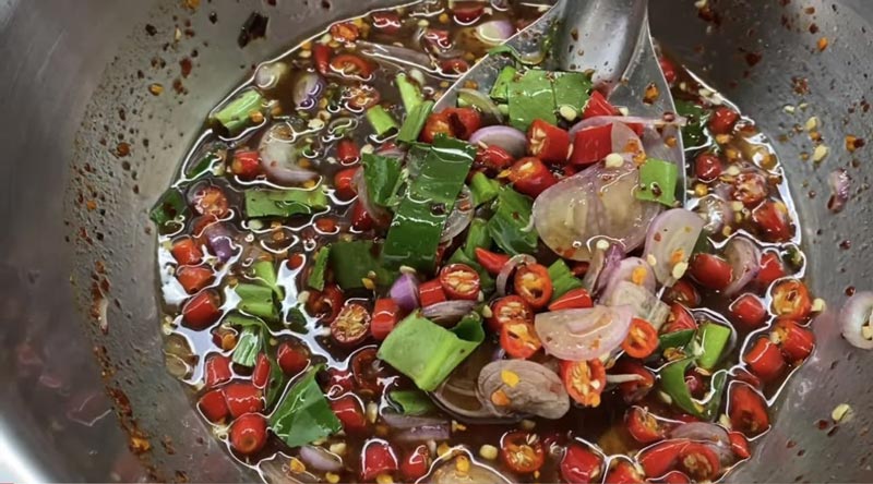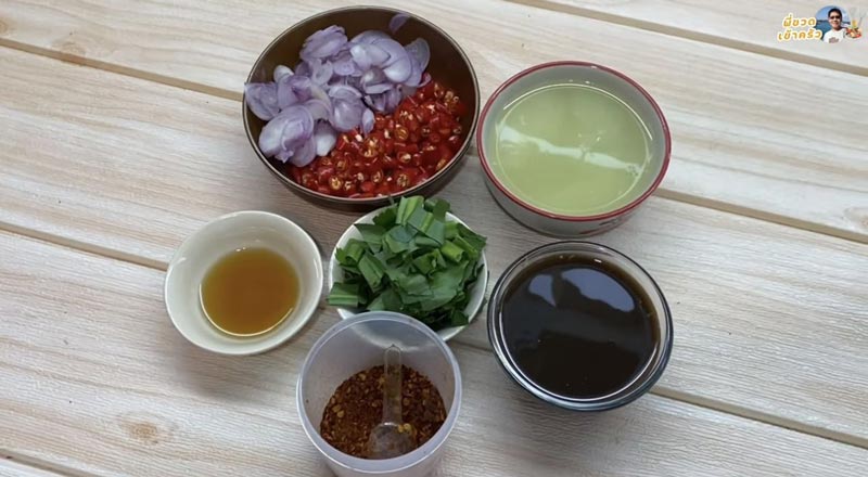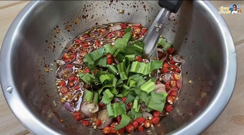 4. แต่ถ้าจะกินเลยก็ใส่พริกซอย หอมแดงซอย และผักชีฝรั่งได้เลย