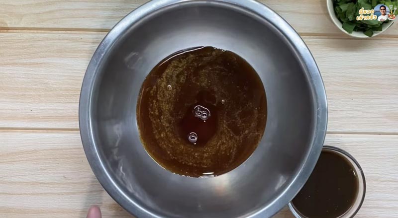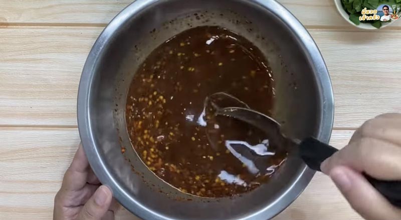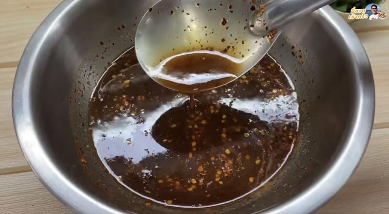 1. ใส่น้ำตาลเคี่ยว น้ำปลาร้า น้ำปลา น้ำมะนาว และพริกป่นตามชอบ เพราะแต่ละบ้านกินเผ็ดไม่เท่ากัน