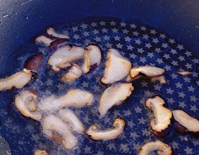 • เห็ดหอมแช่น้ำจนนิ่ม หั่นเป็นเส้น ๆ