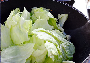 2. ใส่กะหล่ำปลีลงไป (ไม่ต้องรีบคลุกทิ้งไว้สักครู่) จากนั้นค่อย ๆ ผัดกะหล่ำปลีให้สุกเกือบทั่ว นำมา