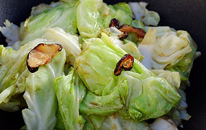 ครู่ค่อยผัด) โดยนำกะหล่ำปลีไปถู ๆ กับขอบกระทะที่เราเหยาะซีอิ๊วไปเมื่อสักครู่ พอสุกทั่วปิดไฟ ตัก