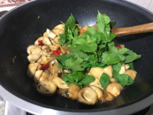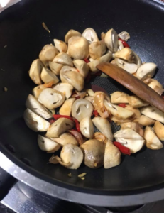 4.ใส่เห็ดฟาง เติมน้ำสะอาดเล็กน้อย ปรุงรสด้วยน้ำปลา น้ำตาลทราย