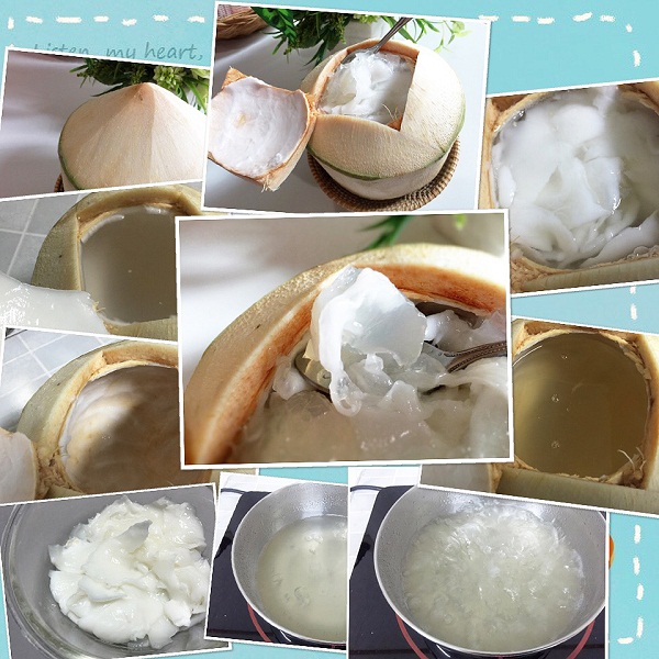 • 2. นำมะพร้าวมาเฉาะให้ปากออกให้มีขนาดค่อนข้างใหญ่พอสมควรเพื่อจะได้สะดวกในการตักเนื้อออก จากนั้นเทน้ำมะพร้าวออกแล้วกรองใส่หม้อ เตรียมไว้