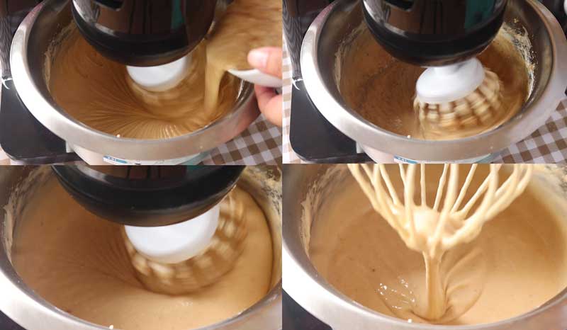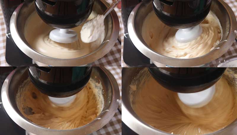 ◇ ค่อย ๆ ใส่แป้งเค้กที่ร่อนพร้อมผงฟูและเบกกิ้งโซดาลงไป ตีจนเข้ากัน