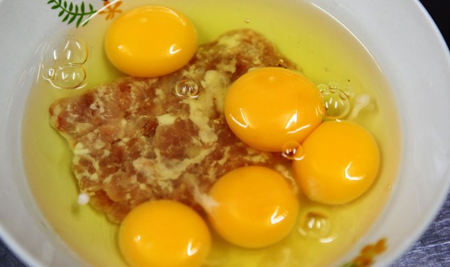 2 ตามด้วยไข่ไก่ยีให้แตกกันผัดซักครู่ ห มูสับตามลงไปผัด ใส่เส้นเล็กลงไปผัด
