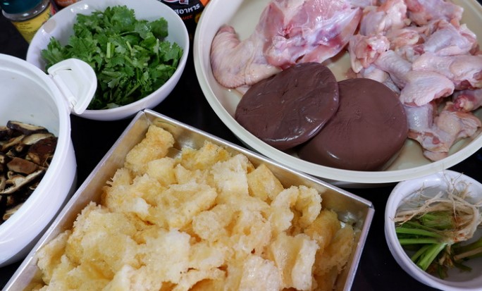 ใส่กระเพาะปลาลงไป รอเดือดอีกหน ใส่ไก่ฉีกลงไป ชิมรสชาติ เติมซอสเพิ่มตามชอบ