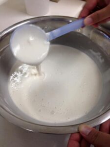 2.ใส่กะทิตามลงไปแล้วคลุกเคล้ากับแป้งผสมให้เข้ากันดีนะคะ
