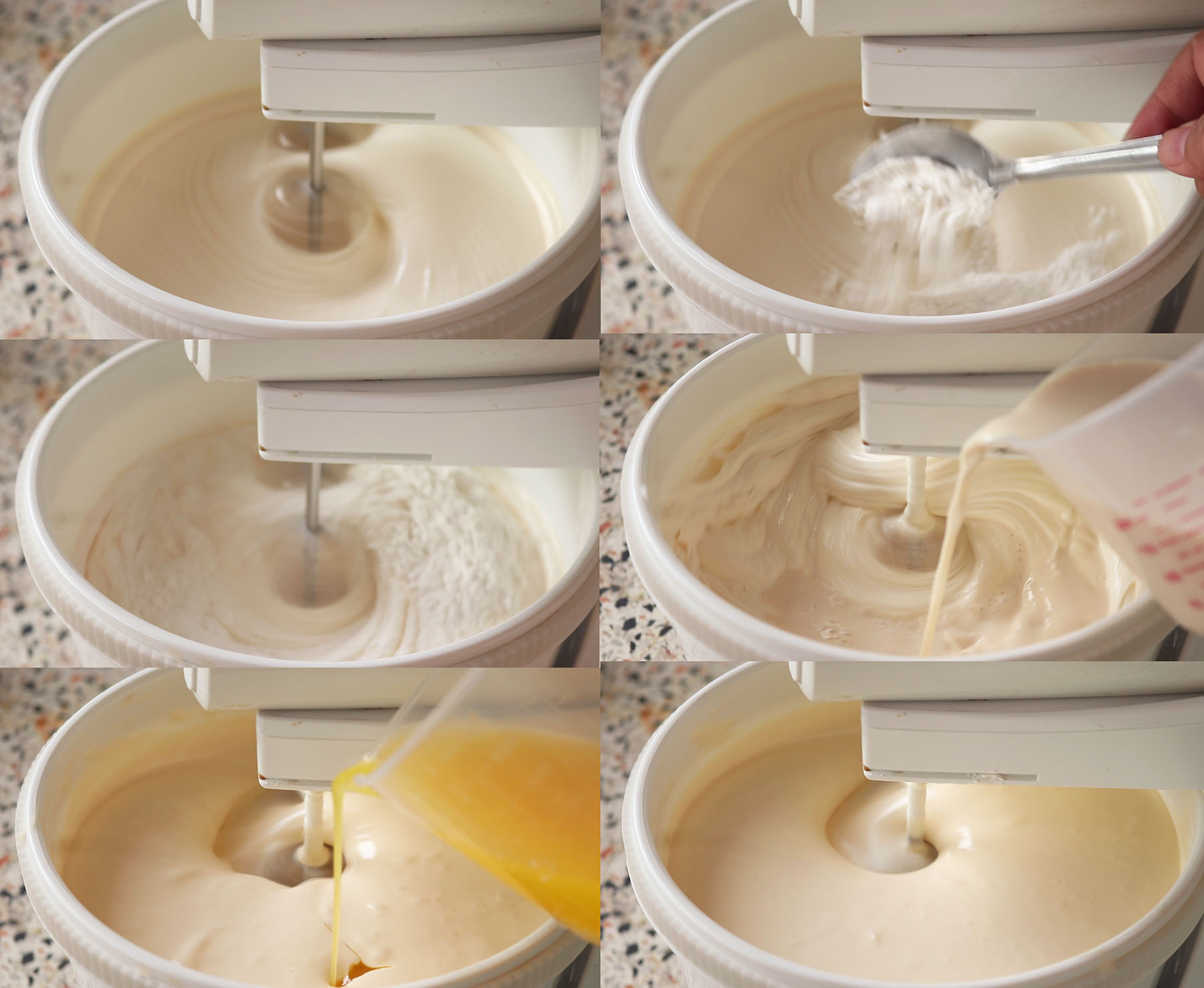 2.จากนั้นค่อยๆใส่มแป้งสาลีเอนกประสงค์ที่ร่อนพร้อมแป้งบัวแดง +ผงฟู+เกลือป่น แบ่งใส่สลับกับนม สัก 3-4 รอบ พอตีเข้ากันดีแล้ว ค่อยๆทยอยใส่เนยละลาย(ที่อุ่นแล้ว)ลงไปหยอดเป็นสาย จากนั้นตีต่ออีก 5 นาที