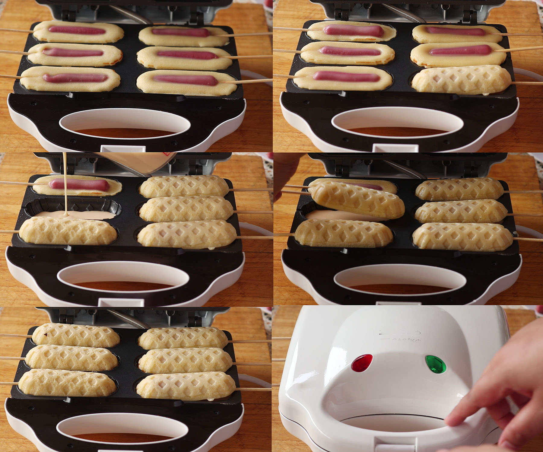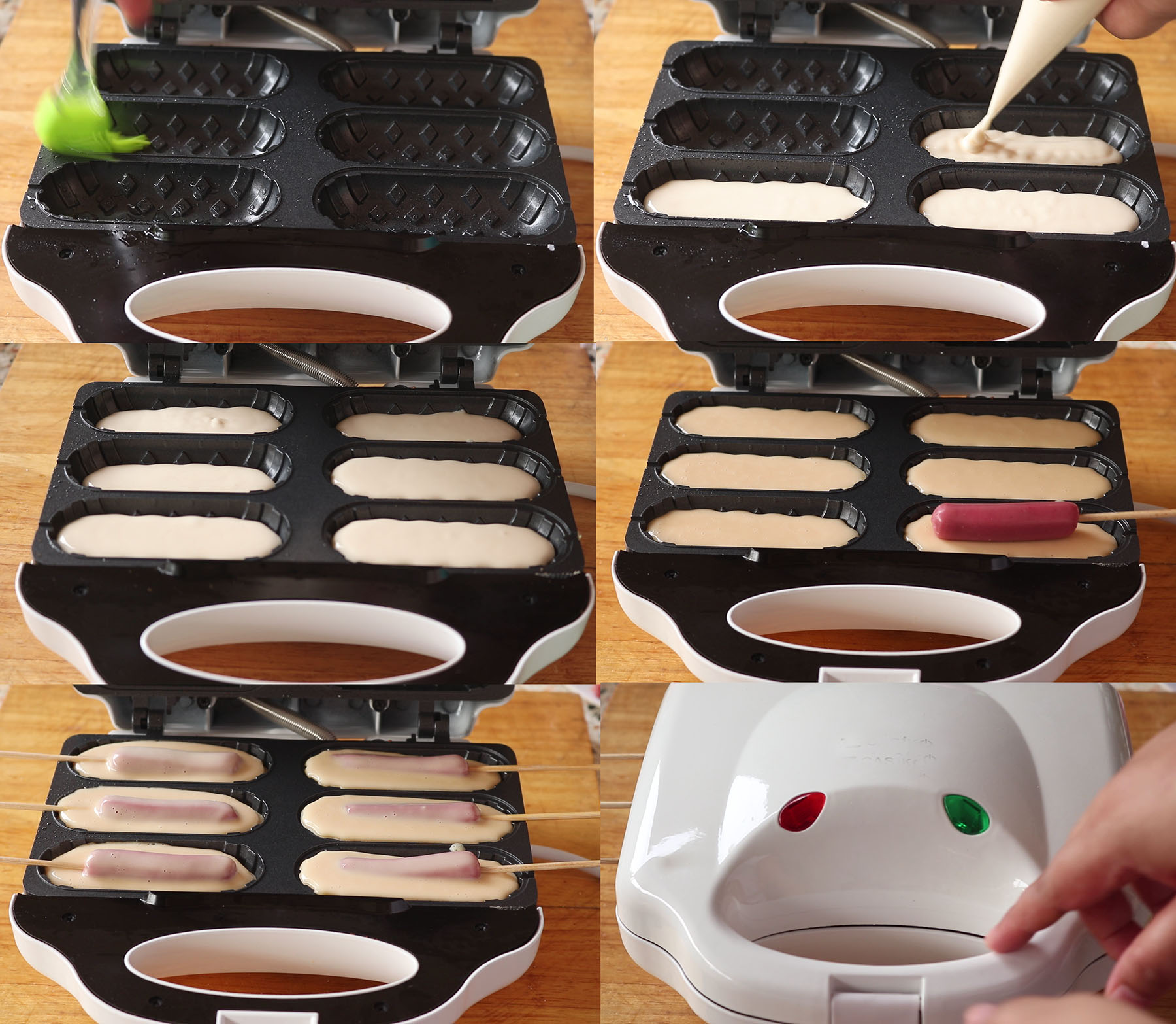 3.อุ่นเตาจนร้อน จากนั้นทาด้วยน้ำมัน เทแป้งลงไป 3/4 พิมพ์ ใส่ไส้กรอกลงไป อบประมาณ 4 นาที
