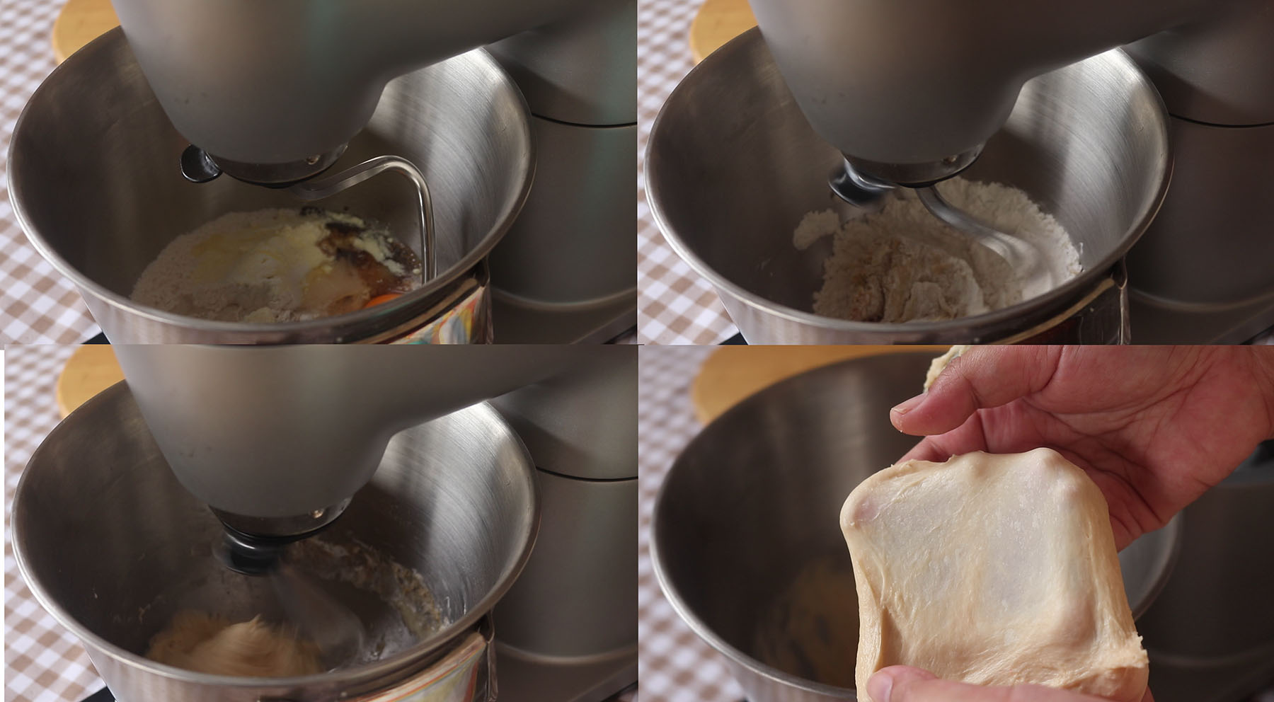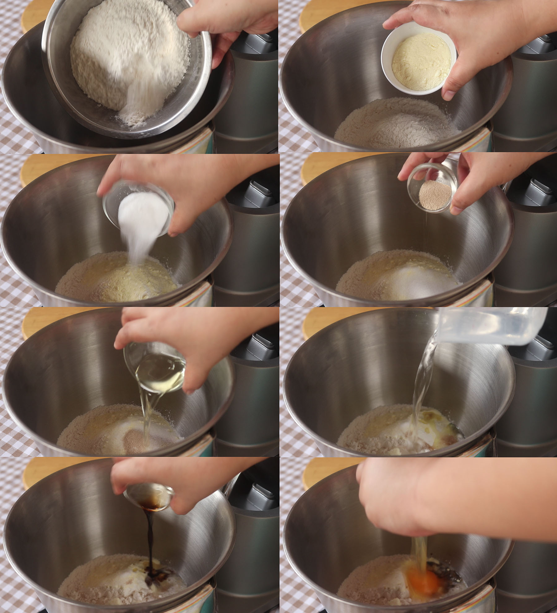 1.ใส่แป้งขนมปังนมน้ำตาลทรายยีสต์ เกลือป่นน้ำมันรำข้าวน้ำเปล่ากลิ่นวานิลลา