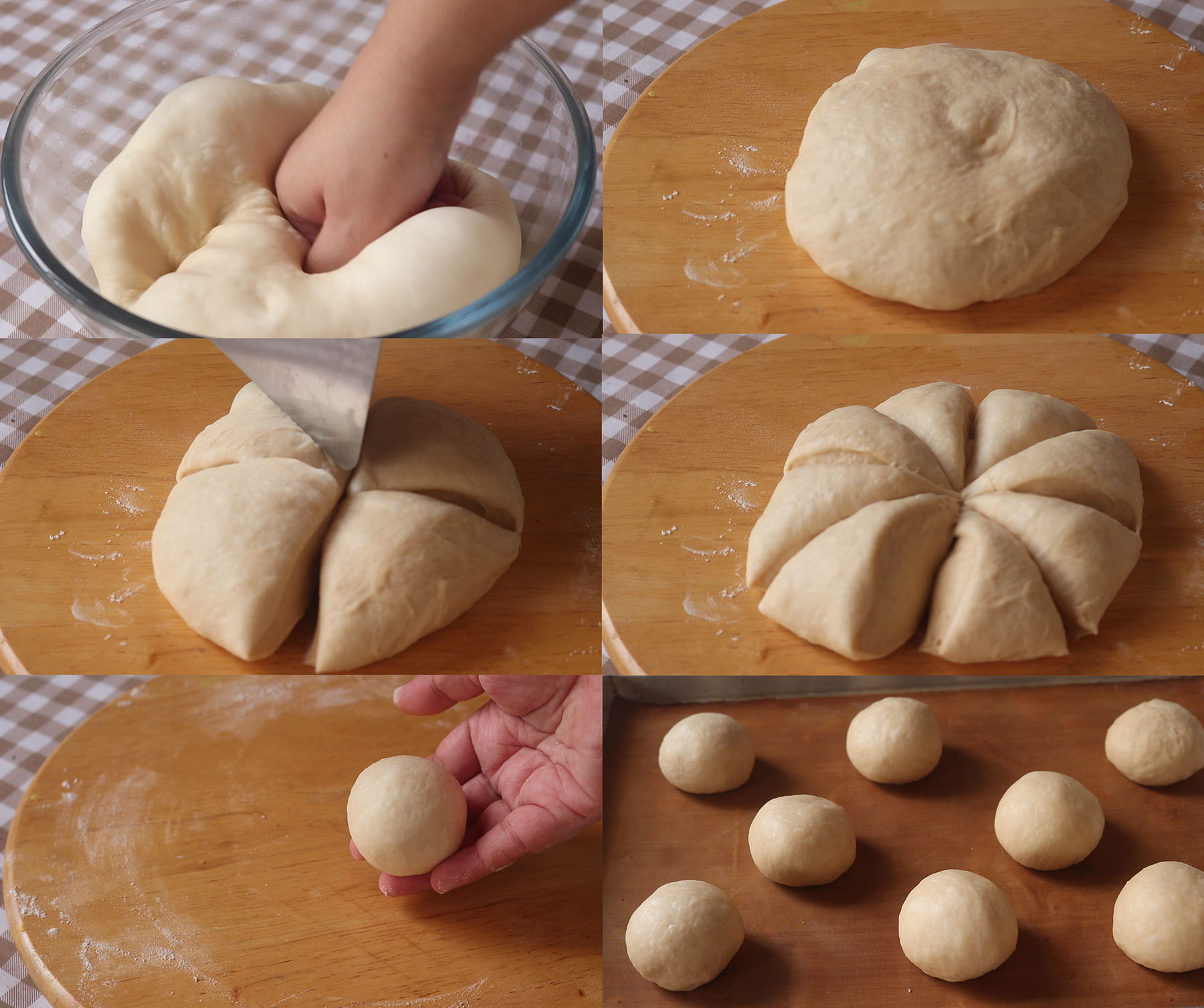 4.หรือจนกว่าแป้งจะฟูขึ้นเป็น 2 เท่าชกไล่ลม นวดแป้งประมาณ 1-2 นาที พอแป้งขึ้นฟูแล้วแบ่งแป้งเป็น 8 ส่วนเท่าๆกัน คลึงเป็นลูกกลมๆ พักแป้ง 10 นาที