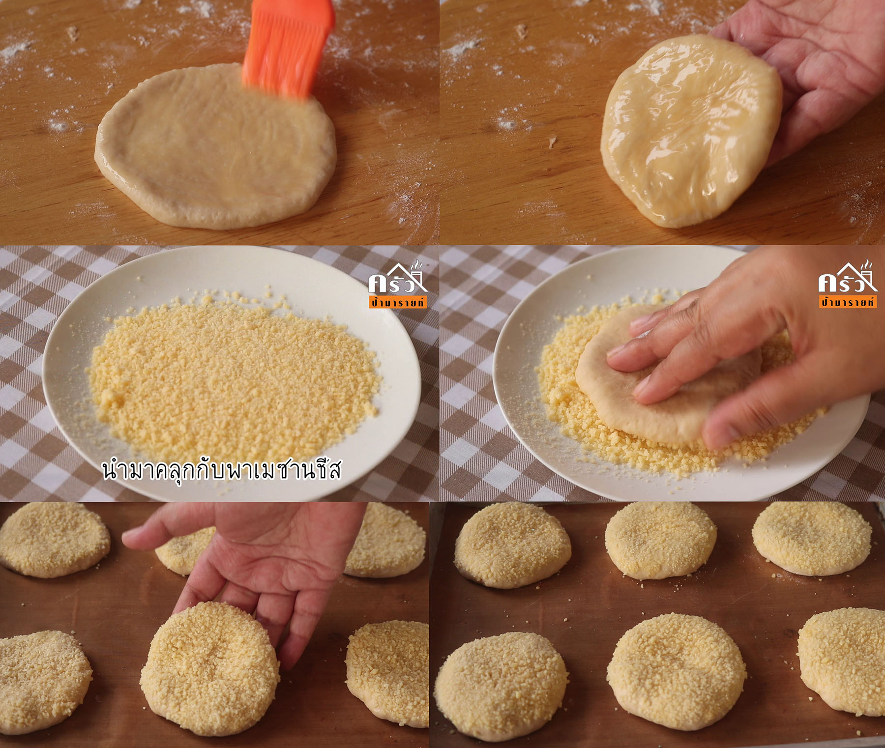 6. ทาไข่ไก่ นำมาคลุกกับพาเมซานชีสพักให้ขึ้นฟูประมาณ 80 %