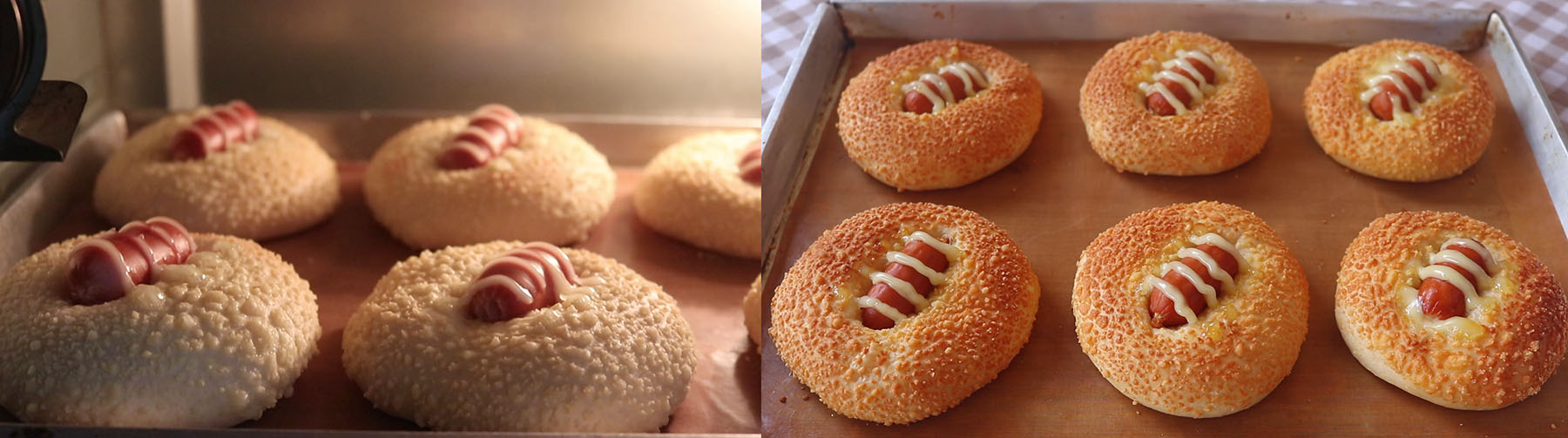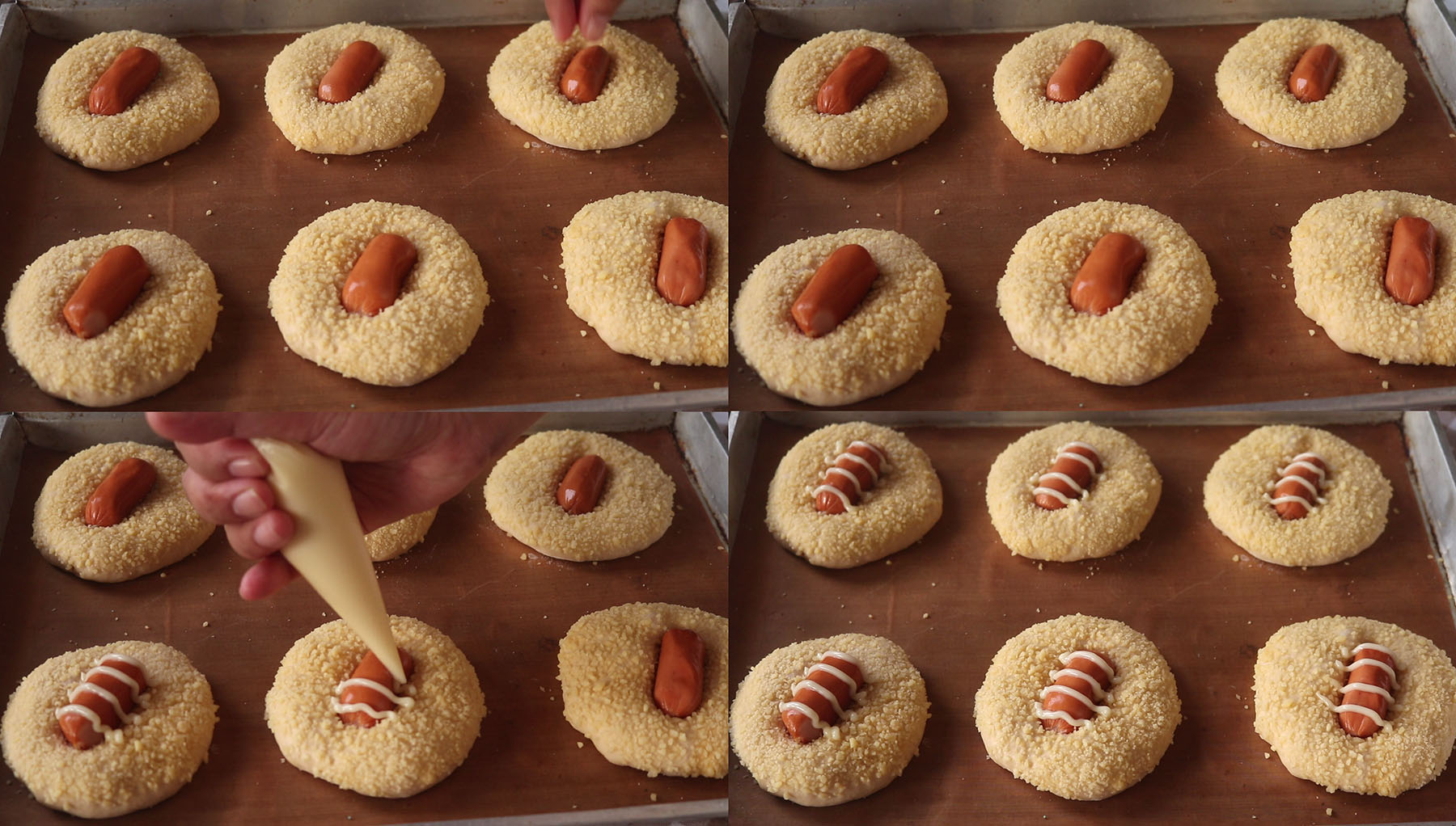 7.พอฟูแล้ววางไส้กรอก กดลงไปตรงกลาง ราดด้วยมายองเนส