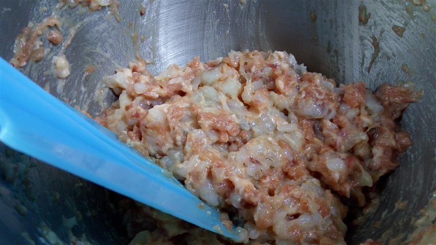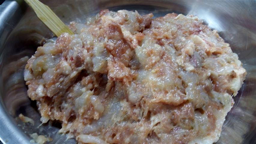 3. ตีกุ้งให้เข้ากัน ถ้าชอบแบบมีรสสัมผัสก็ตีพอแตกแล้วก็ผสมกัน แล้วผสมหมูบดลงไป แล้วใส่ส่วนผสมทั้งหมดลงไป แล้วตีเบาๆ ให้เข้ากัน