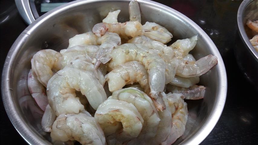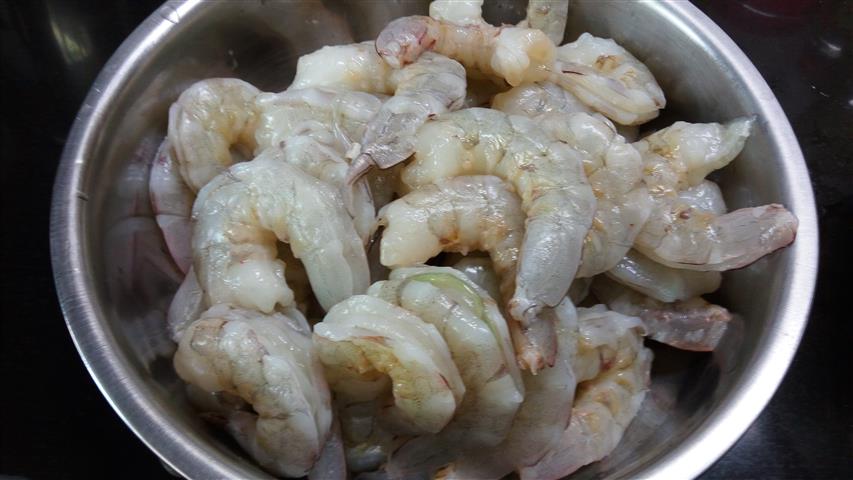 2. แกะกุ้งล้างเอาขี้ดำๆ ออกให้หมด แล้วล้างน้ำสะอาด